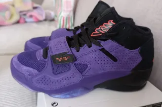 Zapatillas Jordan Zion en color morado y negro, nuevas a estrenar. - Cierre de velcro. - Detalle de Zoom Air en el lateral. - Diseño deportivo y moderno. Escucho ofertas razonables Su precio es de 100 a 120 en tienda