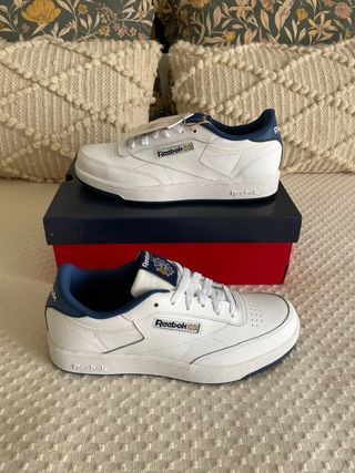 Zapatillas deportivas de la marca Reebok en color blanco con detalles en azul. - Diseño clásico y versátil. - Cierre con cordones blancos. - Detalle del logo de Reebok en el lateral y la lengüeta. - Suela de goma blanca.