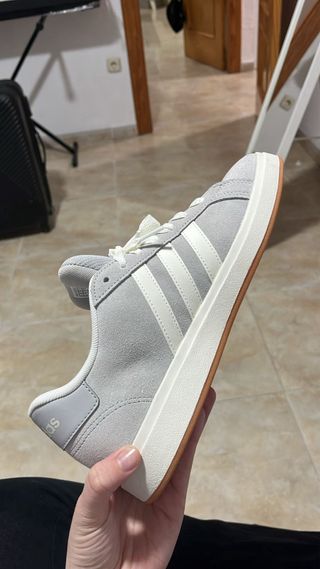 Zapatillas casuales de la marca Adidas en tonos grises y blancos. Perfectas para el día a día. - Usadas una vez - Diseño deportivo y moderno. - Cierre con cordones. - Detalle de las tres franjas icónicas de Adidas.