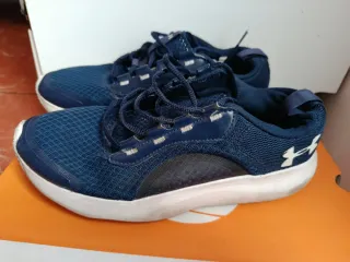 Zapatillas deportivas Under Armour HOVR Mega en talla 41. Combinan azul y amarillo con cordones de rompecabezas. Usado un par de veces. No conservo la caja original. - Diseño moderno. - Detalle de logo en el talón.
