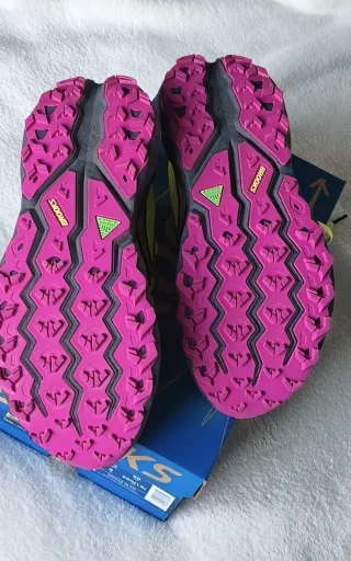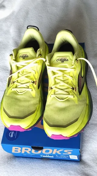 Zapatillas de trail running Brooks Cascadia 19. Usadas solo dos veces, están muy nuevas. Tengo el pie demasiado fino y se me quedan anchas de horma. Son muy cómodas, con buena amortiguación y agarran genial en las bajadas.