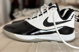 Zapatillas de baloncesto Nike LeBron. - Diseño en blanco y negro. - Detalle de Swoosh en negro. - Suela blanca con detalles grises.