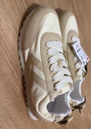 Zapatillas de estilo deportivo con un diseño moderno. - Combinación de colores beige y gris. - Detalle del logo 'N' en el lateral. - Cordones a juego con el diseño.