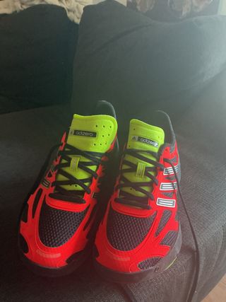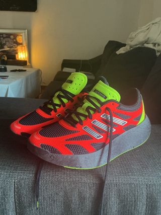 Zapatillas deportivas Adidas Adizero para running. - Diseño llamativo en rojo y verde. - Cordones negros. - Suela con buen agarre.