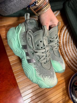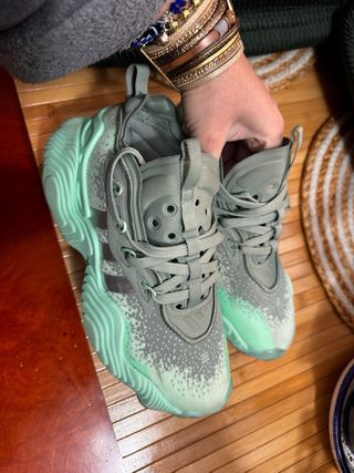 Zapatillas de baloncesto Adidas Trae Young 3. - Diseño moderno en tonos grises y verdes. - Detalles de la marca en plateado.