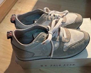Zapatillas casuales de la marca U.S. Polo Assn. - Diseño deportivo. - Combinación de colores beige y marrón. - Detalle de bandera en el talón.