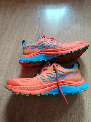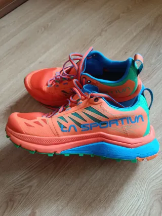 Zapatillas de trail running La Sportiva Jackal en llamativos tonos naranja y verde. En tienda web estan sobre los 150euros. Diseñadas para ofrecer rendimiento en terrenos irregulares. - Parte superior de malla transpirable. - Suela con tacos para un agarre óptimo. - Sistema de lazada seguro.