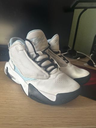 Zapatillas deportivas Jordan de la talla 46, totalmente a estrenar - Diseño moderno en blanco, negro y turquesa - Cordones negros. - Logo de Jordan en la lengüeta.