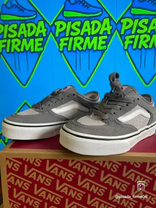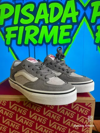 Zapatillas de la marca Vans en tonos grises y blancos. 📱@pisada_firme04 - Diseño deportivo. - Combinación de ante y lona.
