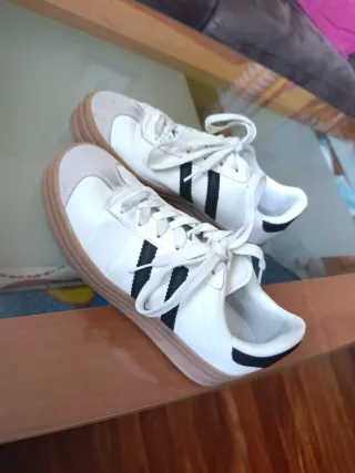 Zapatillas deportivas en color blanco y azul verdoso, talla 38. - Diseño clásico con las tres franjas. - Cordones a juego con el detalle de las franjas. - Suela de goma duradera.