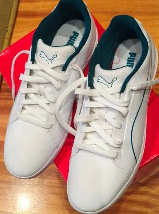 Zapatillas Puma Marcedes AMG Petronas en color blanco con detalles en verde azulado. Perfectas para el día a día. Núm 44 - Cierre de cordones. - Suela de goma. - Diseño deportivo y moderno.