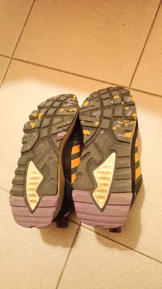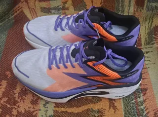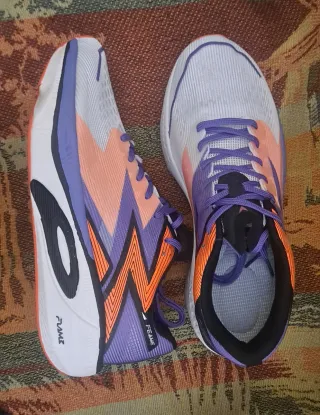 Zapatillas deportivas de running con un diseño moderno y llamativo. - Combinación de colores morado y naranja. - Cordones morados. - Suela blanca con detalles negros y morados.
