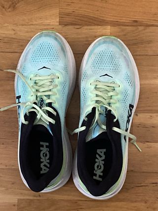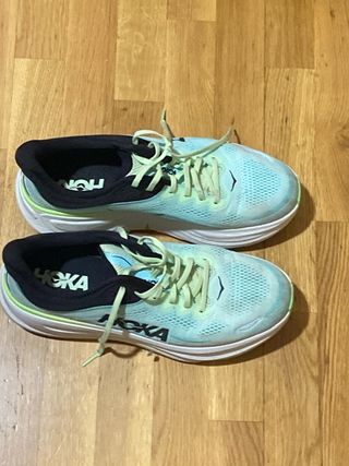 Zapatillas deportivas Hoka en tonos teal y negro. - Diseño moderno y cómodo. - Marca Hoka visible en la plantilla y lateral. La he utilizado 3 veces