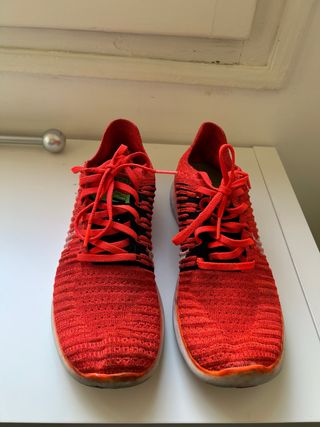 Zapatillas deportivas Nike Flyknit en tonos rojos y negros. Perfectas para running o uso diario. - Diseño moderno y ligero. - Tejido transpirable. - Suela flexible.