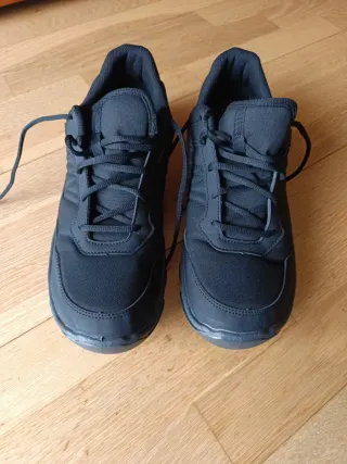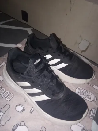 Zapatillas deportivas Adidas en color negro, talla 42. Perfectas para el día a día o para hacer deporte. - Diseño con las tres franjas blancas. - Cierre de cordones. - Suela blanca.
