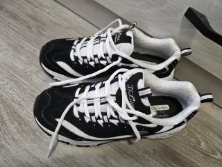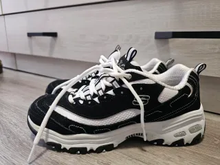 Zapatillas deportivas Skechers con un diseño moderno y cómodo. - Combinación de colores negro y blanco. - Cordones blancos. - Suela gruesa y robusta.