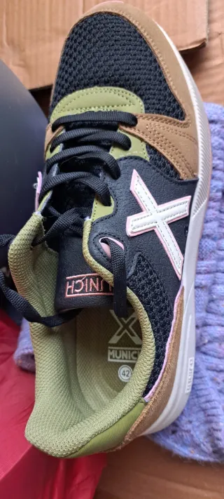 Zapatillas Munich de estilo deportivo y casual. - Combinación de colores negro, marrón, verde y rosa. - Diseño moderno con el logo 'X' característico de la marca. - Materiales mixtos para un look urbano.