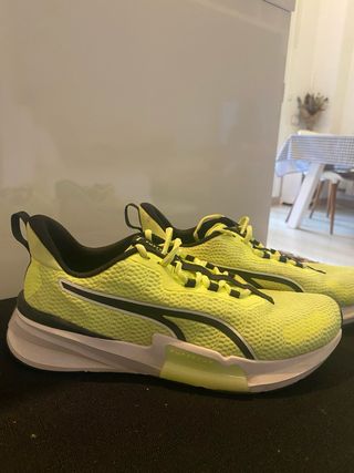 Zapatillas deportivas Puma con un diseño moderno y llamativo. - Combinación de colores amarillo y negro. - En tienda 57,90€ - Suela blanca y gris. - Suela nueva. Usadas 3 veces