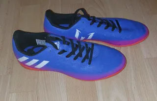 Zapatillas de fútbol sala de la marca Adidas con el logo de Lionel Messi. - Talla 38 (aunque realmente se asemeja a una 36 por medida) - Diseño con degradado de azul a lila. - Detalles de rayas blancas. - Logo del futbolista Messi en blanco. - Suela plana de color naranja. - Cordones largos de color negro.