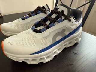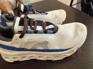 Zapatillas deportivas de la marca On Running en color blanco con detalles azules. - Diseño moderno y ligero. - Cordones con patrón. - Suela con tecnología CloudTec.