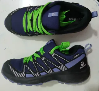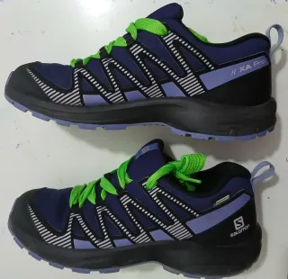 Zapatillas deportivas Salomon XA Pro en talla 40. Combinan un diseño llamativo con detalles en azul y verde. - Cierre con cordones. NO SON LOS CORDONES ORIGINALES PERO SE PUEDEN CANVIAR SI NO GUSTAN - Tirador en el talón. - Logo de Salomon en el lateral. - Detalle de líneas blancas y negras en el diseño.