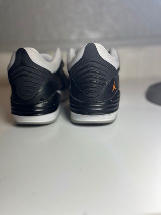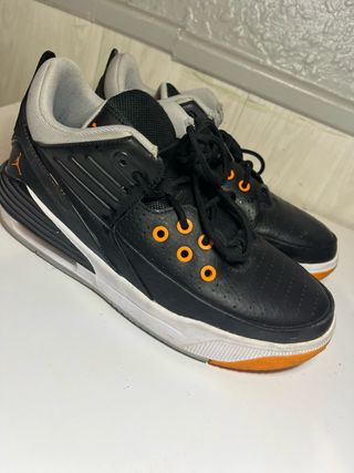 Zapatillas deportivas Jordan en talla 38.5. - Diseño en color negro con detalles en naranja. - Cierre con cordones.