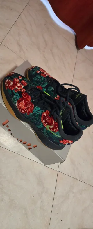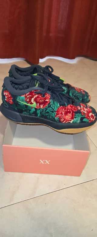 Zapatillas deportivas Nike con un llamativo diseño floral. - Base negra con estampado de rosas rojas y hojas verdes. - Detalles en color verde lima. - Suela de goma.