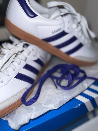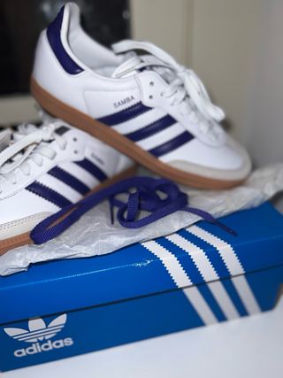 Zapatillas Adidas Samba con un diseño clásico y deportivo. - Combinación de blanco y morado. - Suela de goma. - Detalle de las tres rayas.