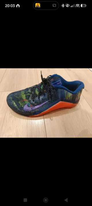 Zapatillas deportivas Nike Metcon, ideales para CrossFit. - Diseño multicolor vibrante. - Cordones negros con detalles plateados.