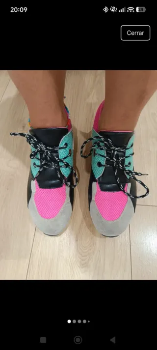 Playeras de colores: ante negro y resto fucsia, turquesa, negro, leopardo y suela blanca con puntos negros. Son con plataforma en talón sin cámara de aire. Los desperfectos se ven en las últimas dos fotos: - plataforma por la zona interior oscurecida por el roce. - ambas playeras por el interior están algo descosidas por la zona del talón y la plantilla está gastada.