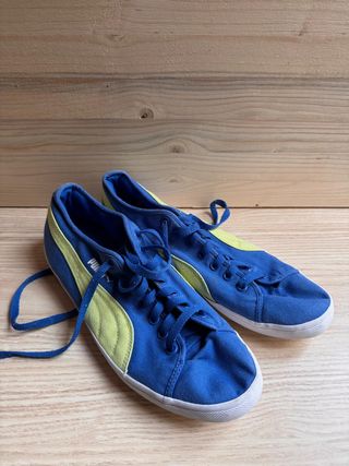 Zapatillas deportivas Puma en llamativos tonos azul y verde. Perfectas para un estilo casual y activo. Diseño de lona, cierre con cordones y logo de Puma en la lengüeta y plantilla