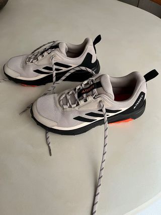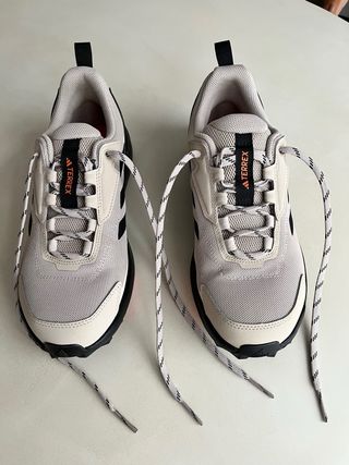 Zapatillas deportivas Adidas Terrex Anylander en tonos beige y negro. Perfectas para senderismo o uso diario. - Diseño moderno y funcional. - Cierre de cordones. - Suela de goma para mayor agarre.