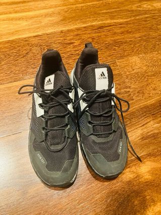 Zapatillas deportivas Adidas Terrex en color negro. Perfectas para actividades al aire libre. - Diseño deportivo. - Cierre con cordones. - Detalle de las tres bandas Adidas. - En muy buen estado - No tiene cordón es goma, abría que cambiarla