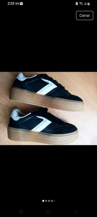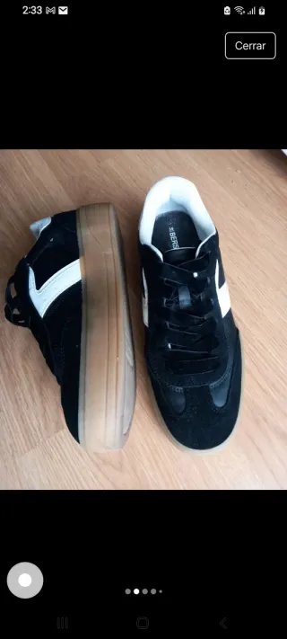 Zapatillas deportivas de polipiel negra y blanca, con contraste en símil serraje. Tiene plataforma color camel engomada y cordones de terciopelo. Puestas un rato me están grandes, se puede ver la suela intacta. - Suela de plataforma. - Combinación de colores negro y blanco. -Cordones terciopelo
