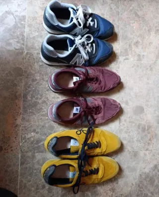 Lote de zapatillas deportivas y casual de varias marcas. Talla 44. Cada par a 12€, y el pack completo a 30€. - Zapatillas deportivas New Balance azules. - Zapatillas deportivas New Balance burdeos. - Zapatillas casual Silbón amarillas…parte de atrás desgastada.