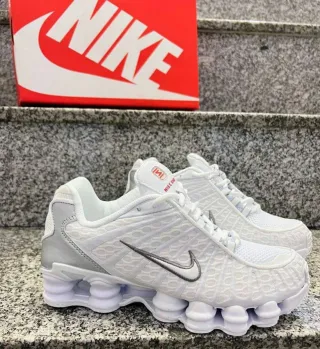 Zapatillas deportivas Nike Shox con un diseño moderno y llamativo. Perfectas para el día a día. - Combinación de colores blanco y plateado. - Detalle del logo Swoosh. - Suela con tecnología Shox para mayor amortiguación.