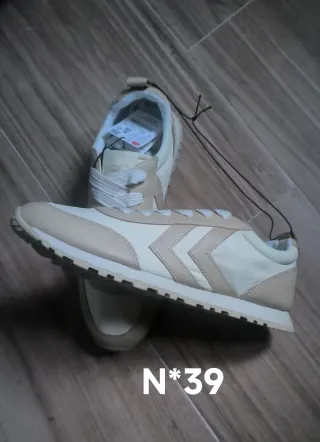 Zapatillas deportivas de la marca Hummel en talla 39. Combinan tonos beige y blanco para un estilo casual. - Diseño deportivo. - Cierre con cordones.