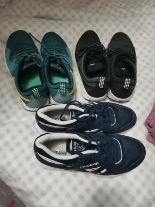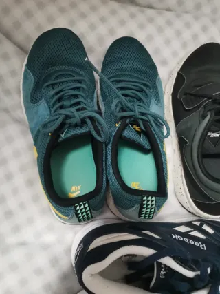 Lote de tres pares zapatillas deportivas variadas. Estan usadas, pero ninguna está rota, ni x fuera ni x dentro... - Zapatillas de color verde azulado con detalles amarillos Nike. Talla 44. - Zapatillas negras con suela moteada nike. Talla 43. - Zapatillas azul marino de la marca Reebok. Talla 43.