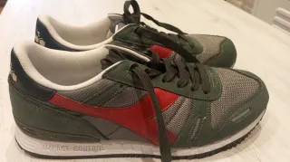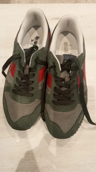Zapatillas deportivas Diadora con un diseño moderno y llamativo. Usadas dos veces como se ve la suela nueva. - Combinación de colores verde y rojo. - Materiales textiles y ante. - Cierre con cordones verde. - Logo de la marca en la plantilla.