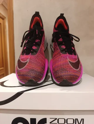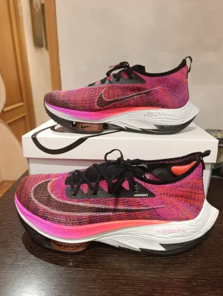 Zapatillas de running Nike Alphafly en llamativos tonos rosas y negros. Diseñadas para ofrecer un rendimiento óptimo. - Tejido de malla transpirable. - Detalles en color burdeos. - Suela con tecnología Zoom. - Cierre con cordones negros. -Tienen 10km -Originales con su caja y bolsa