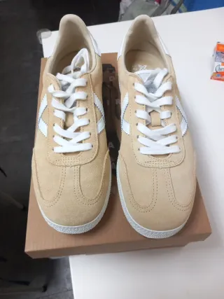 Zapatillas deportivas Munich de ante en color beige y detalles blancos. Perfectas para el día a día. - Cierre con cordones. - Suela de goma. - Diseño clásico.