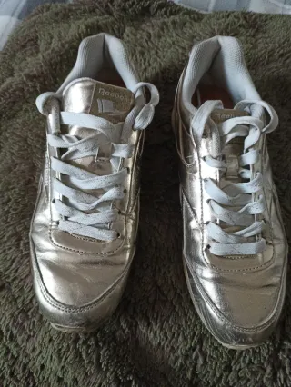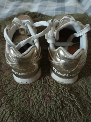 Zapatillas deportivas Reebok en color dorado. Son ligeras, con un peso aproximado de 500 gramos. - Diseño moderno y llamativo. - Cierre con cordones para un ajuste seguro. - Ideales para uso diario o deportivo.