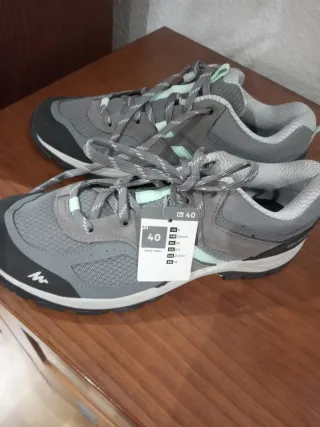 Zapatillas de senderismo Quechua, nuevas a estrenar. - Diseño moderno en tonos grises y detalles en verde menta. - Cierre con cordones para un ajuste seguro. - Suela robusta para mayor tracción.