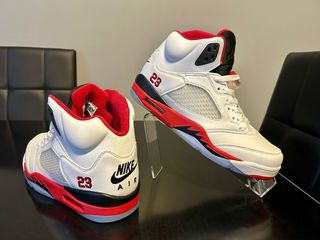 Zapatillas Jordan 5 Retro Fire Red. - Diseño icónico con detalles en rojo y blanco. - Número 23 bordado en el talón. - Logo Nike Air en la suela. - En su caja.