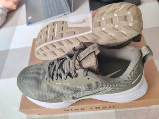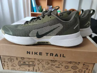 Zapatillas deportivas Nike Trail en tono verde oliva. Perfectas para tus aventuras al aire libre. - Diseño de malla transpirable. - Suela de goma para mayor agarre. - Detalle de logo Nike en el lateral. No las he utilizado ni 5 veces, están en perfecto estado, como se puede apreciar en las fotos, ni una sola marca. Las vendo porque me he hecho unas plantillas y no me caben. (Nunca se han usado por montaña y los tacos no están nada desgastados)