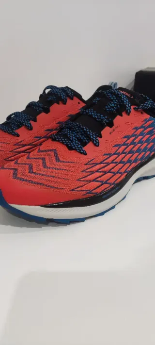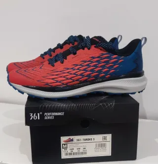 Zapatillas de trail running 361 Taroko 3 en color naranja y azul. Diseñadas para un rendimiento óptimo en terrenos difíciles. - Modelo: Taroko 3 - Parte superior con diseño Morphit - Tecnología Quikfoam en la mediasuela - Cordones azules - Suela de goma para tracción