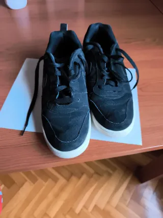Zapatillas de estilo casual en color blanco y negro. - Diseño deportivo. - Suela de goma con grosor normal que permite flexibilidad y resistencia. - Cierre con cordones. - Materiales: cuero sintético. Piel imitación curtida vegetal. - Impermeables. Nunca se han usado ya que pedí una talla de más.