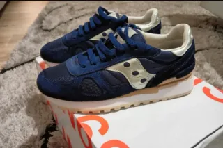 Zapatillas deportivas Saucony en tonos azules con detalles dorados. - Diseño deportivo. - Combinación de materiales.