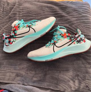 Zapatillas deportivas Nike con un diseño llamativo. - Parte superior de malla transpirable. - Detalle multicolor en el talón y la lengüeta. - Suela de goma para mayor tracción. Han tenido algo de uso pero están muy bien cuidadas y son muy cómodas para deporte y uso diario