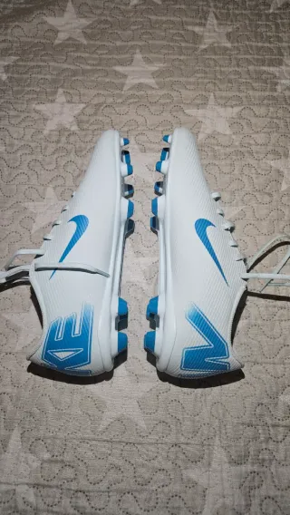 Zapatillas de fútbol con suela de tacos. - Color blanco con detalles en azul. - Diseño deportivo.